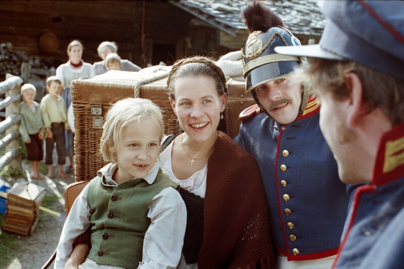 Von links: Lorenz (Tamino Wecker), seine Mutter Afra (Kerstin Becke), Leutnant Josef Naus (Johannes Zirner) und sein Bursche Schani (Andreas Nickl).Bild: © BR/Marco Orlando Pichler