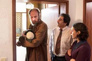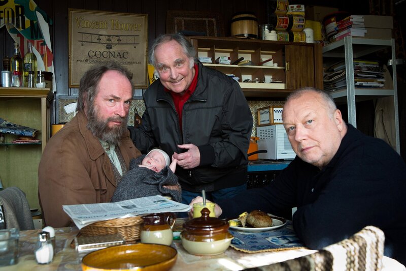 v.li.: Herbert Knaup als Hans Scholz mit Baby, Regisseur Michael Verhoeven und Thomas Thieme als Wenzel.Bild: © SWR/Martin Furch