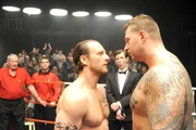 Um Annes Schulden begleichen zu können, setzt der sich seit Jahren im Ruhestand befindliche Boxer "Kamikaze Kalle" (Hendrik Duryn, l.) alles auf eine Karte. Er trägt seine letzten Schätze ins Pfandhaus. Und dann wettet er auf sich selbst - gegen den hoch favorisierten Mad Martin (Marco Bednarz, r.) ...