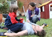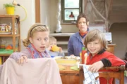 Wegen ihrer großen finanziellen Probleme hat Anne (Alexandra Neldel, M.) wenig Zeit, um auf ihre Kinder Becki (Camille Dombrowski, l.), Tobi (Kilian Safarik, r.) und das Baby einzugehen. Wider Erwarten entpuppt sich der Ex-Boxer "Kamikaze Kalle" als wunderbarer Babysitter ...