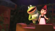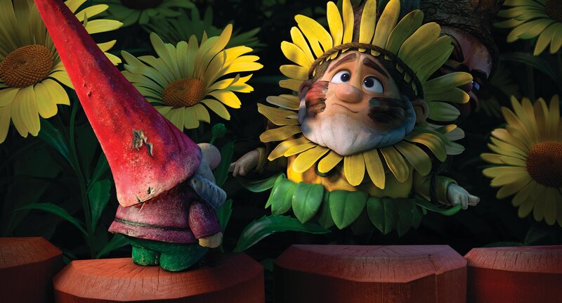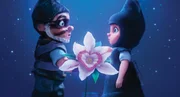 Gnomeo und Julia haben sich ineinander verliebt und treffen sich heimlich in einem Garten, in dem sie den Flamingo Featherstone kennenlernen.Bild: © Courtesy of Disney+