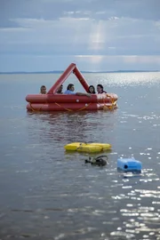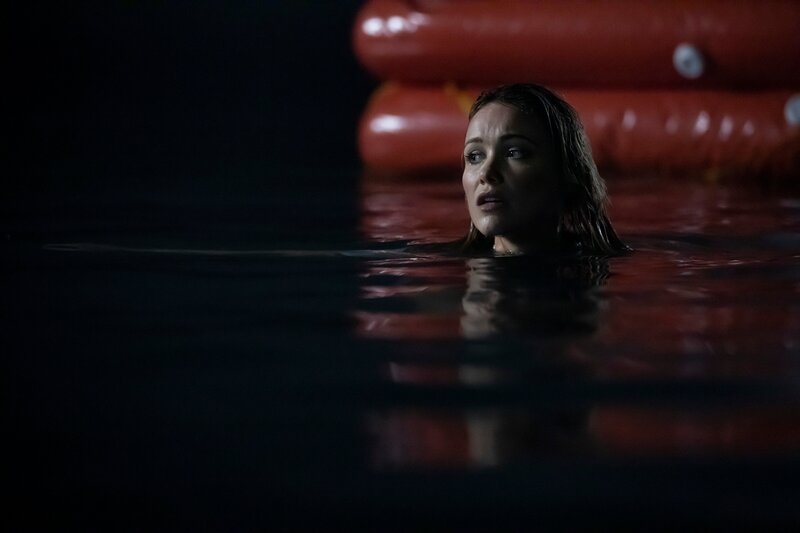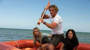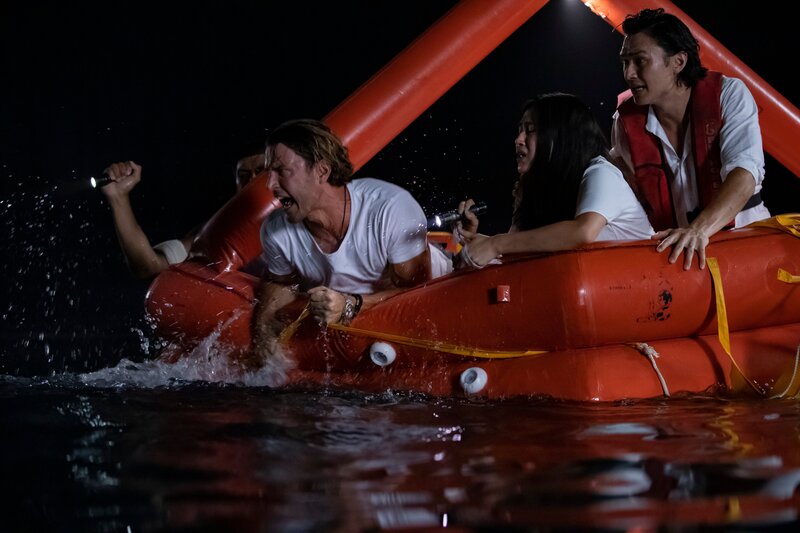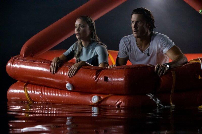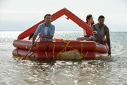 Charlie (Aaron Jakubenko, li.) und die anderen vier Passagiere können sich auf eine aufblasbare Rettungsinsel retten, treiben nun aber ziellos auf dem offenen Ozean umher. Und unter der Wasseroberfläche lauern riesige hungrige Haie?; Charlie (Aaron Jakubenko, li.) und die anderen vier Passagiere können sich auf eine aufblasbare Rettungsinsel retten, treiben nun aber ziellos auf dem offenen Ozean umher. Und unter der Wasseroberfläche lauern riesige hungrige Haie…Bild: © RTLZWEI