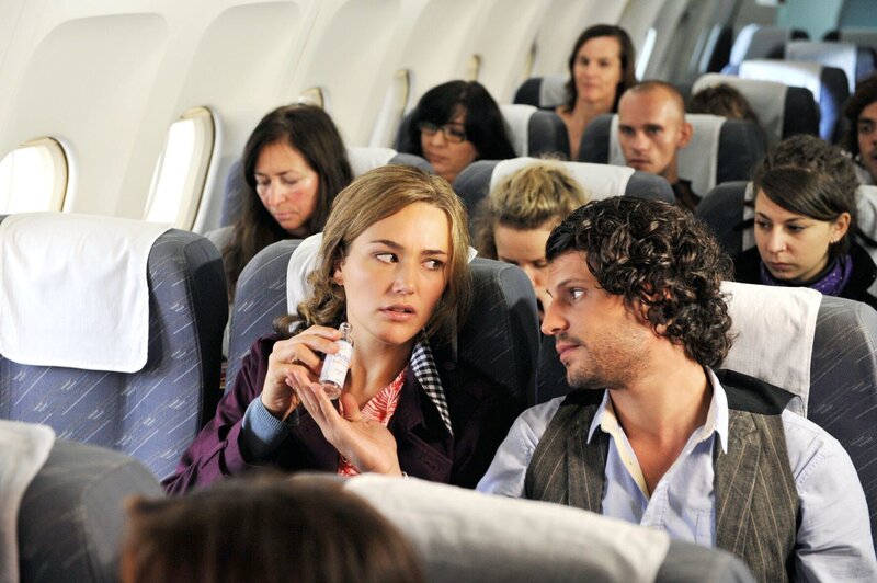 Trotz ihrer Flugangst beschließt Vanessa (Alissa Jung, vorne l.), Tim nachzureisen und um ihn zu kämpfen. Mit Hilfe ihres freundlichen Sitznachbarn Janis (Manuel Cortez, vorne r.) und etlicher Ouzos übersteht sie schließlich die Anreise ...