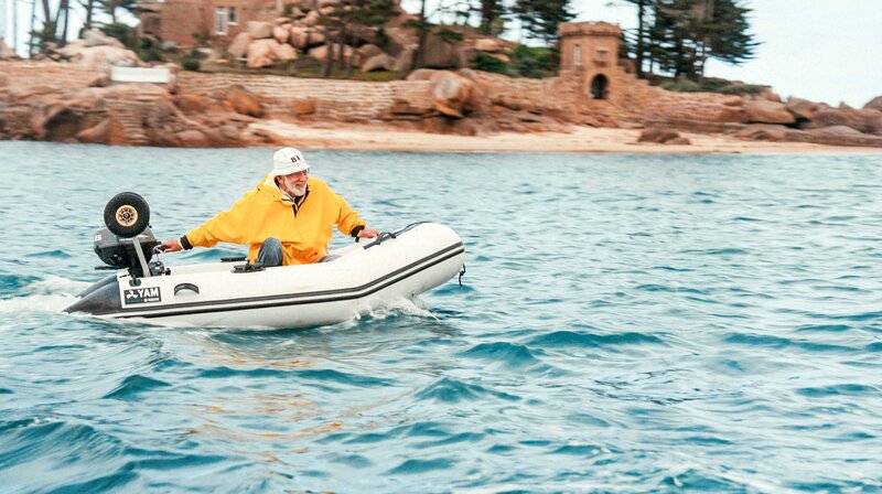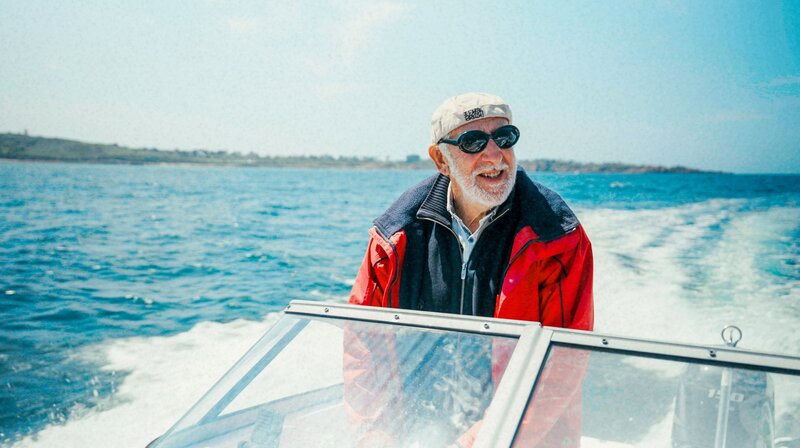 Dieter Hallervorden auf dem Motorboot vor seiner Privatinsel in Nordfrankreich.Bild: © WDR/eitelsonnenschein/Till Vielrose