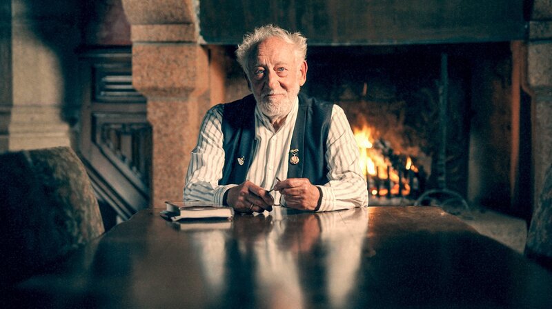 Dieter Hallervorden sitzt am Esstisch in seinem privaten Anwesen auf der Insel Costaérès in Nordfrankreich.Bild: © WDR/eitelsonnenschein/Till Vielrose