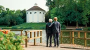 Dieter Hallervorden und sein Sohn Johannes Hallervorden blicken auf die Synagoge im Wörlitzer Park Dessau.Bild: © WDR/eitelsonnenschein/Till Vielrose