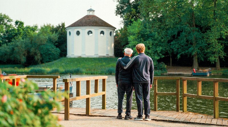 Dieter Hallervorden (rechts) mit seinem Sohn Johannes Hallervorden (links) im Wörlitzer Park Dessau.Bild: © WDR/eitelsonnenschein/Till Vielrose