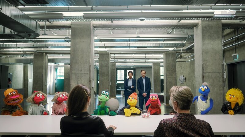 Die Puppen von "Hallo Spencer" werden von ihren neuen Besitzern Jette Wilde (Marina Galic, l.) und Magnus Wilde (Jens Harzer, r.) auf Vermarktbarkeit getestet. Ilknur (Aybi Era, 2.v.l.) und Friederich (Hendrik v. Bültzingslöwen, 2.v.r.) assistieren ihnen dabei.Bild: © Gordon Timpen / ZDF
