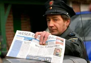 rbb Fernsehen ARD THEMENWOCHE 2012 "LEBEN MIT DEM TOD", HALTET DIE WELT AN, Deutschland 2010, Regie Hartmut Griesmayr, am Donnerstag (22.11.12) um 20:15 Uhr. Der örtliche Polizist André (Thorsten Merten) präsentiert die Titelseite über das Verschwinden des kleinen Tobias.Bild: © rbb/Degeto/Gordon A. Timpen