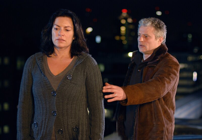 Katja (Christine Neubauer) ist dem Polizisten Roman (Filip Peeters) für seinen Beistand unendlich dankbar.Bild: © ARD Degeto/Gordon A. Timpen