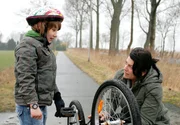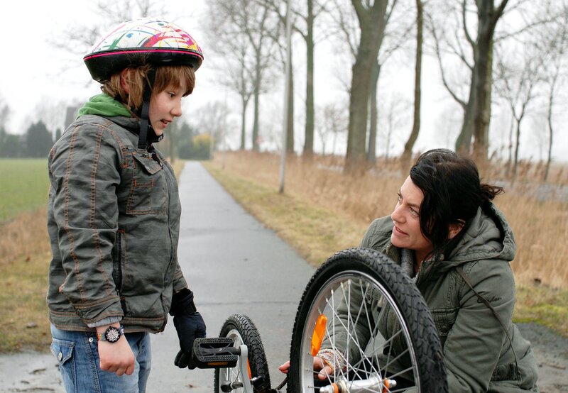Katja (Christine Neubauer) hilft ihrem Sohn Tobias (Ludwig Skuras), sein Fahrrad wieder in Gang zu bringen - danach verschwindet er spurlos.Bild: © rbb/Degeto/Gordon A. Timpen