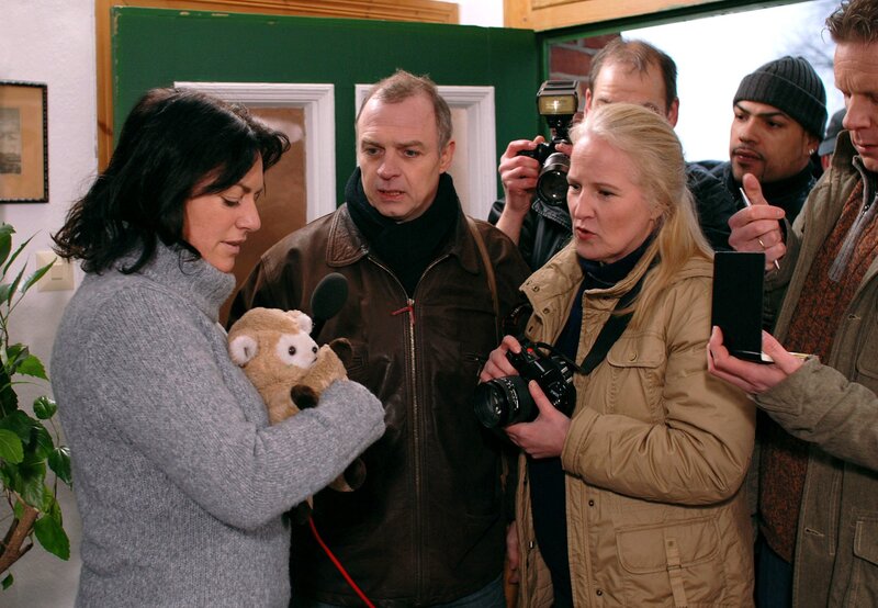 Katja (Christine Neubauer) wird von sensationslüsternen Reportern belagert.Bild: © ARD Degeto/Gordon A. Timpen