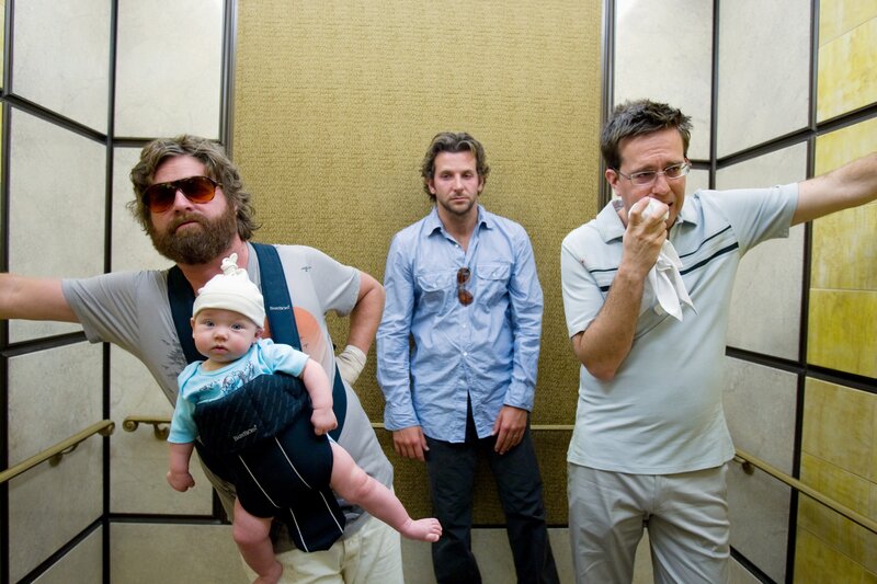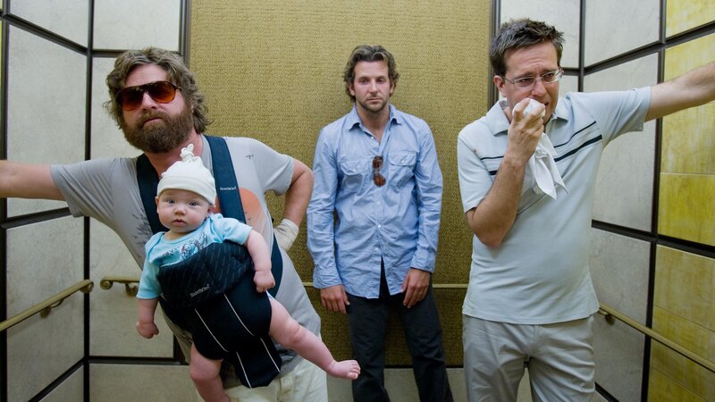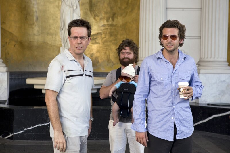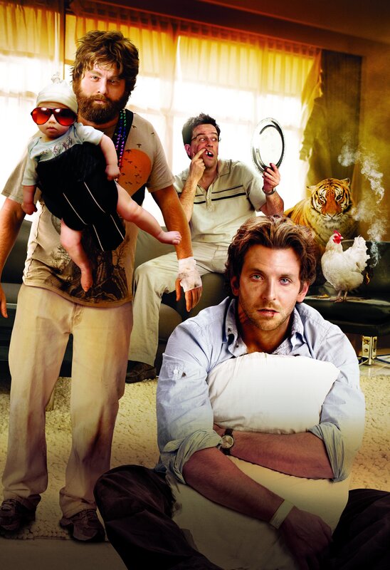 Zum Junggesellenabschied fahren Doug, der Bräutigam in spe, und seine drei Freunde nach Las Vegas und quartieren sich im Caesar's Palace ein. Am nächsten Morgen wachen sie auf und können sich an die vergangene, wilde Nacht nicht mehr erinnern und von Doug ist keine Spur. Stattdessen haben Phil (Bradley Cooper, M.), Stu (Ed Helms, r.) und Alan (Zach Galifianakis, l.) ein Baby an Bord und einen Tiger im Hotelzimmer.