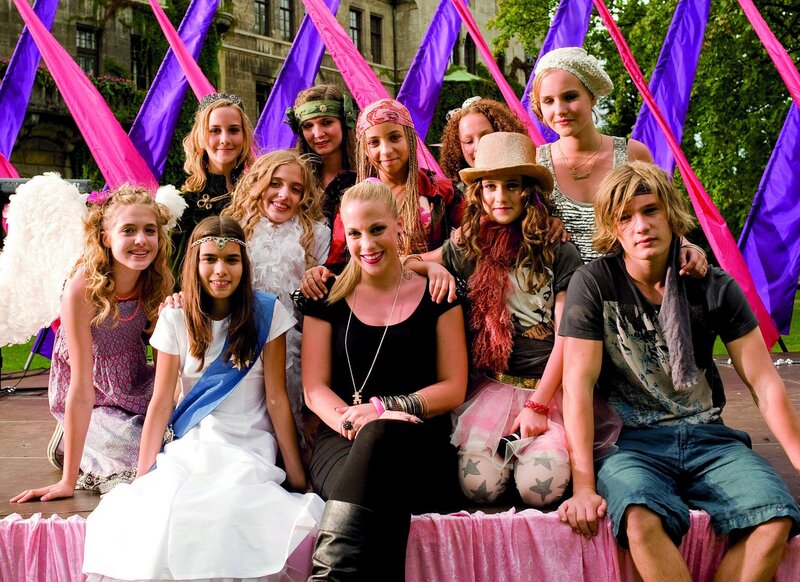 Die Lindenhof-Schülerinnen zusammen mit der Sängerin LAFEE (vorne, Mitte) und dem attraktiven Neffen von Mademoiselle Bertoux, Phillipe (Sven Gielnik, vorne rechts), bei den Dreharbeiten auf Schloss Faber-Castell.Bild: © ZDF/Ufa Cinema/Gordon Mühle