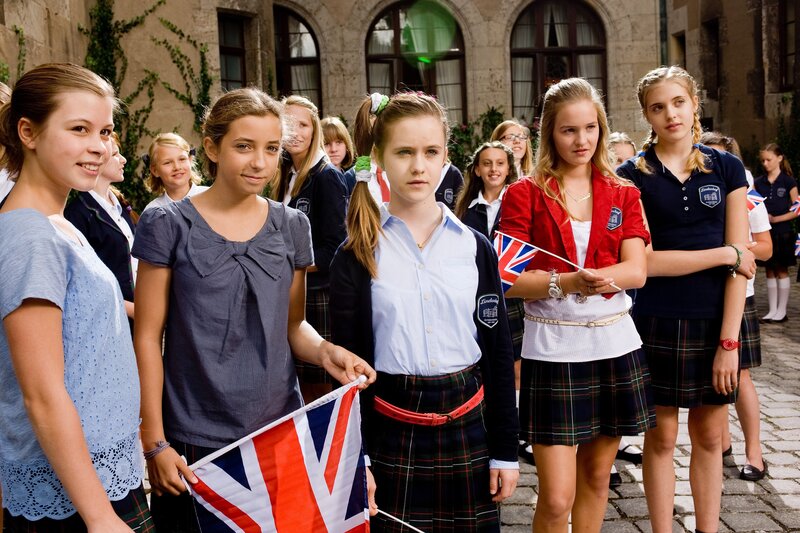 Die Schülerinnen von Internat Schloss Lindenhof trauen ihren Augen nicht, als statt der erwarteten englischen Mädchenklasse eine Busladung englischer Jungs ankommt.Bild: © ZDF/Gordon Mühe