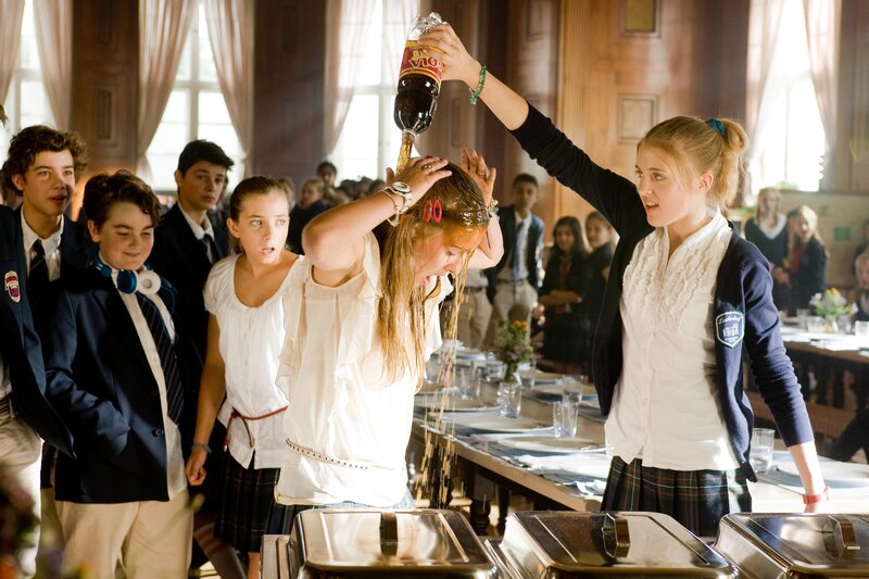 Vor allen Schülern rächt sich Hanni (Jana Münster, vorne r.) mit Genuss und einer saftigen Cola-Dusche an Daniela (Nele Guderian, vorne l.) für deren heimtückischen Versuch, Hanni die begehrte Rolle der "Julia" wegzuschnappen.Bild: © UPI - United Pictures International / MKNS