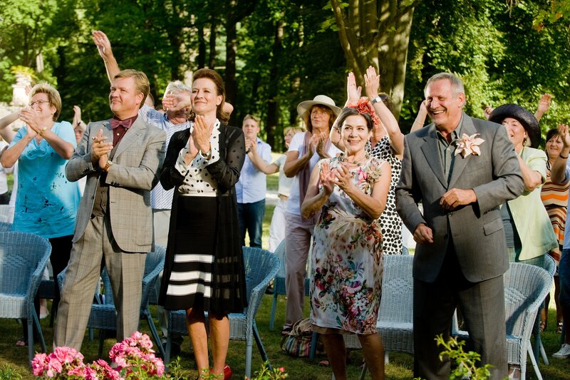 Bei der modernen Schüleraufführung von "Romeo und Julia" als coole Dance-Nummer haben auch Mister Hugh Gordon (Justus von Dohnányi, vorne l.), Frau Mägerlein (Suzanne von Borsody, vorne 2.v.l.), Rektorin Theobald (Hannelore Elsner, vorne 2.v.r.) und Professor Kästner (Konstantin Wecker, vorne r.) großen Spaß.Bild: © ZDF/Gordon Mühe