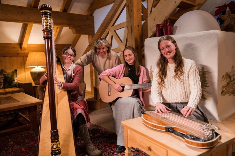 Melissa Naschenweng posiert für ein Foto mit Ziehharmonika im Weihnachtswohnzimmer