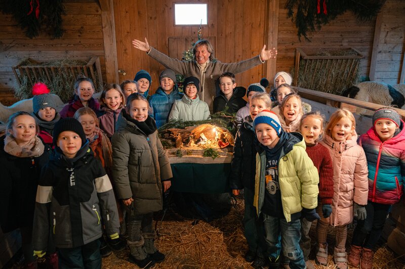 Hansi Hinterseer mit Kindern aus der Volksschule Aurach posieren für ein Foto in einem Stall des Wildparks Aurach
