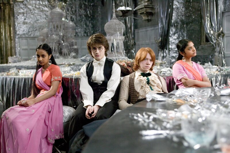 Der Weihnachtsball wird zu einem Desaster, da sowohl Ron (Rupert Grint, 2.v.r.) als auch Harry (Daniel Radcliffe, 2.v.l.) auf die Patil-Schwestern (Afshan Azad, l., Shefali Chowdhury, r.) zurückgreifen müssen ...Bild: © Warner Bros. Ent.