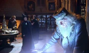 Professor Dumbledore (Michael Gambon, vorne) staunt nicht schlecht, als der Feuerkelch Harrys Namen als Anwärter für das bevorstehende Turnier ausspuckt. Denn der ist eigentlich viel zu jung ...Bild: © 2005 Warner Bros. Ent. Harry Potter Publishing Rights. J.K.R. Lizenzbild frei
