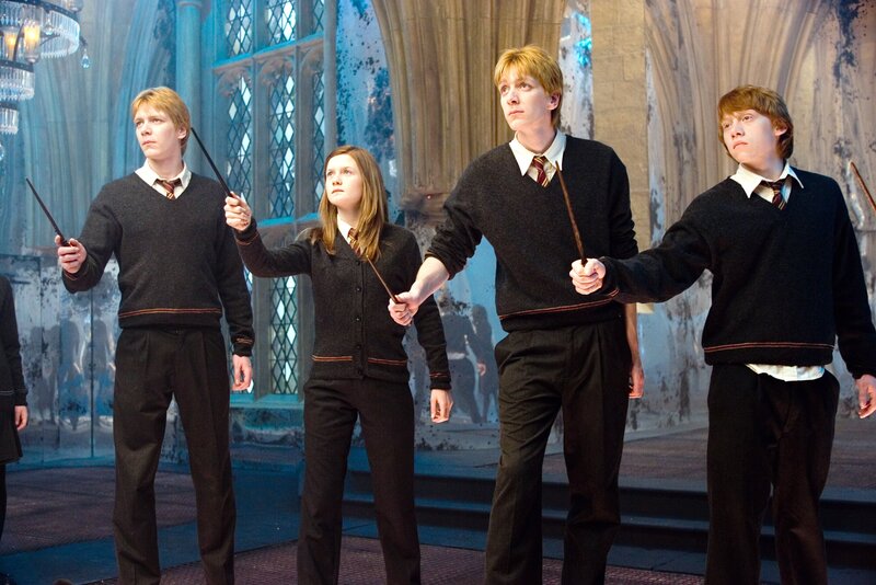 v.l.n.r.: James Phelps als Fred Weasley, Bonnie Wright als Ginny Weasley, Oliver Phelps als George Weasley, Rupert Grint als Ron WeasleyBild: © ProSieben