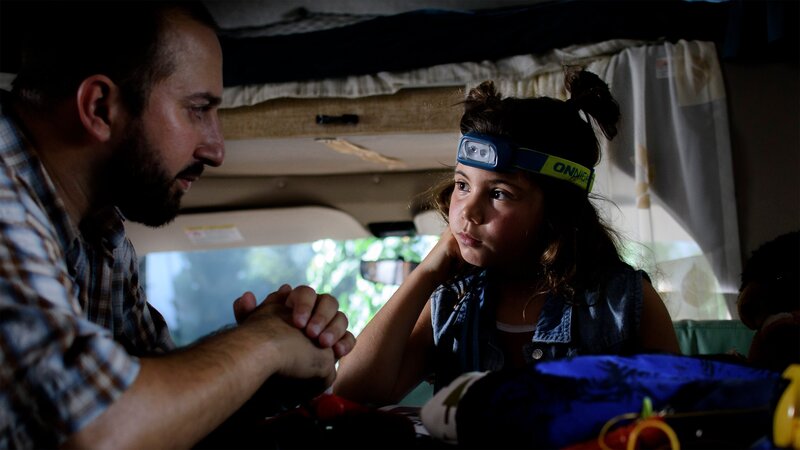 Papa (Gürkan Küçüksentürk) entschuldigt sich bei Jip (Layla Zara Seme) für die Verzögerung ihrer Reise in den Nationalpark.Bild: © NDR/Pief Weyman