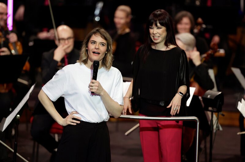 Was haben die Beach Boys, Adele und Die Simpsons gemeinsam? Hazel Brugger verrät es Ihnen - und bringt gemeinsam mit dem WDR Funkhausorchester die Kölner Philharmonie mit ihrem ganz persönlichen Mixtape in Stimmung. Die Playlist der Comedienne, Slam-Poetin und Moderatorin ist ein echter Gute-Laune-Mix: Schnell, beatlastig und rhythmisch schmeißt sie uns vom Club in die aktuellen Charts bis zurück ins Jugendzimmer der 1990er-Jahre. v.l. Hazel Brugger, Sarah Hicks (Leitung) mit dem WDR FunkhausorchesterBild: © WDR/Thomas Brill