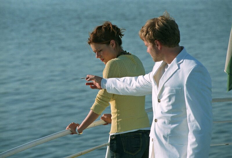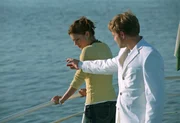 Zu den Hochzeitsfeierlichkeiten ist auch ein Bootsausflug vorgesehen. Paula (Susan Anbeh, l.), die eigentlich seekrank ist, will sich vor dem Hochzeitspaar nicht blamieren und fährt mit. Ben (Janek Rieke, r.) erkennt die Situation und bringt Paula Tabletten gegen Übelkeit.