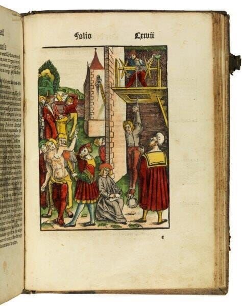 Der Laienspiegel von Ulrich Tengler aus dem Jahr 1509 gilt als eines der bedeutendsten Rechtsbücher der frühen Neuzeit. Der Holzschnitt zeigt gängige Foltermethoden der Zeit.