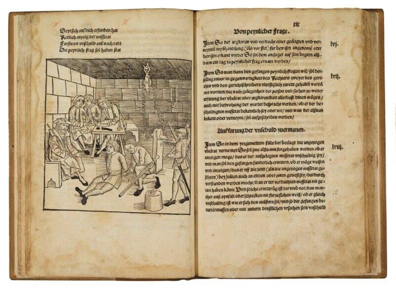 Die ¿peinliche Befragung¿, also Folter, zur Erlangung von Geständnissen war schon in der ¿Bamberger Peinlichen Halsgerichtsordnung¿ (1507) geregelt. Sie wurde bei den Hexenprozessen in verschärfter Form angewandt.