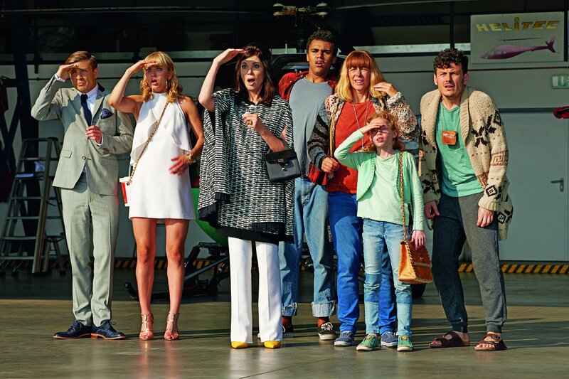 Jannik Schümann (Albrecht von Schlacht), Caro Cult (Aura Schlonz), Iris Berben (Trixi von Schlacht), Langston Uibel (Siddartha Schlonz), Katja Riemann (Carmen Schlonz), Bella Bading (Rosa Schlonz), Manuel Rubey (Gernot).Bild: © ORF