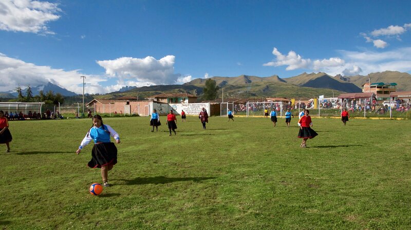 Frauenfußball in 3.600 Metern Höhe: Bei den peruanischen Hochlandmeisterschaften treten die Damen in ihrer traditionellen Tracht an.Bild: © NDR/dmfilm/Manfred Uhlig
