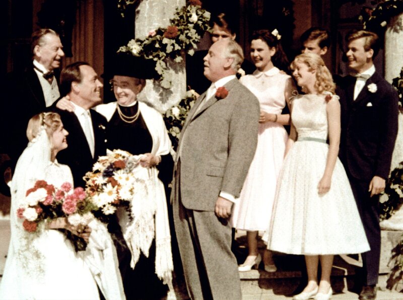 Onkel Pankraz (Hans Nielsen, Mitte) gratuliert seiner Tochter Margot (Karin Andersen, li.) zu ihrer Hochzeit mit Jochen von Roth (Paul Kliner, 3. v. re.). Der reiche Winzer hat außerdem Oma Jatzens (Margarethe Haagen, 4. v. li.) Immenhof gerettet. Die Zukunft von deren Enkeln Dick (Angelika Meissner-Voelker) und Dalli (Heidi Brühl, re.) ist damit gerettet. Cousin Ethelbert (Matthias Fuchs, re.) hatte an dieser Rettung maßgeblichen Anteil.Bild: © BR/ARD Degeto