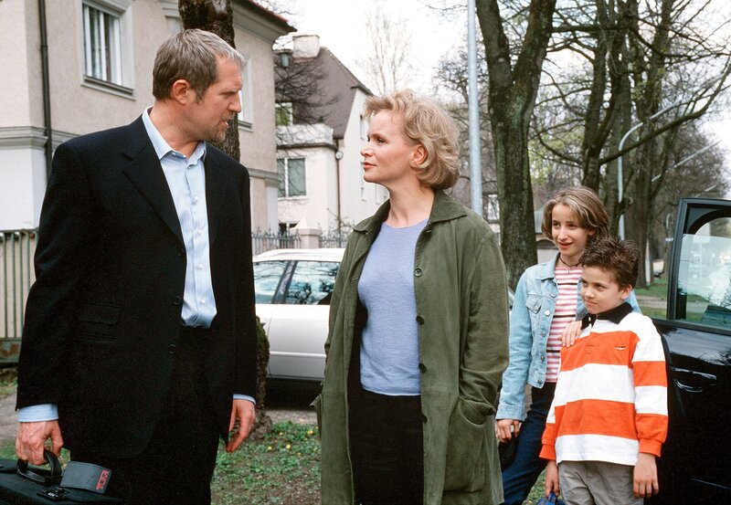 Susanne (Renee Soutendijk) erklärt ihrem Mann Lukas (Harald Krassnitzer), dass sie ihn und die Kinder Jana (Lilin Schiffer, 2. von rechts) und Dominik (Felix Bötsch) verlässt.Bild: © rbb/Degeto