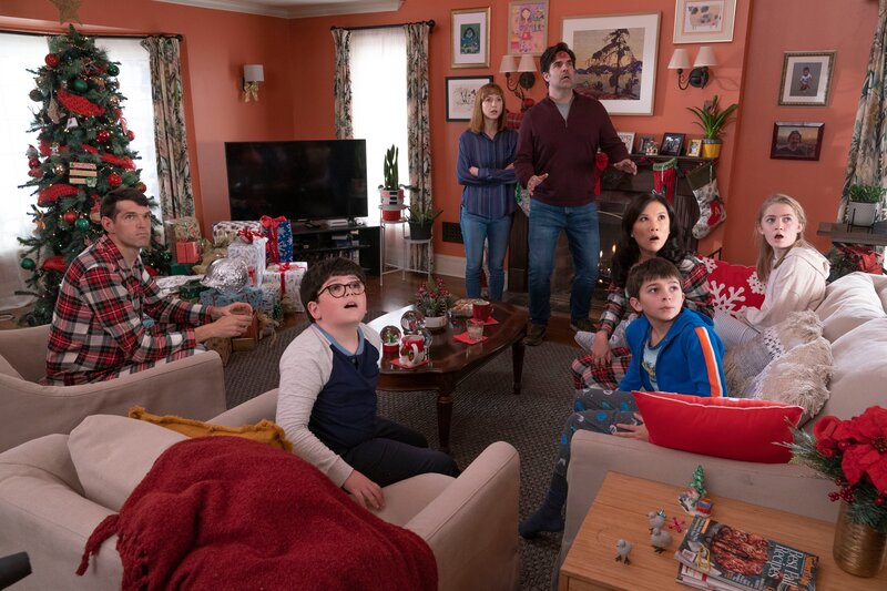 (L-R): Timothy Simons as Hunter, Archie Yates as Max, Ellie Kemper as Pam, Rob Delaney as Jeff, Max Ivutin as Chris, Ally Maki as Mei, and Katie Beth Hall as Abby in 20th Century Studios' HOME SWEET HOME ALONE, exclusively on Disney+. Photo by Philippe Bosse. © 2021 20th Century Studios. All Rights Reserved.Bild: © Disney+