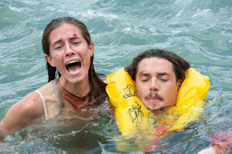 Nachdem die rettende Sandbank von der Flut überschwemmt wurde, haben Sara (Allison Williams, l.) und Jackson (Alexander Dreymon, r.) schon keine Hoffnung mehr, als sie ein Fischerboot entdecken.Bild: © Kelly Walsh / ZDF