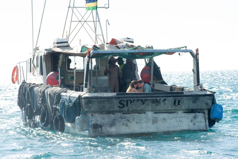 Ein kleines Fischerboot rettet Sara (Allison Williams, l.) und Jackson (Alexander Dreymon, r.) aus dem Indischen Ozean.Bild: © Kelly Walsh / ZDF