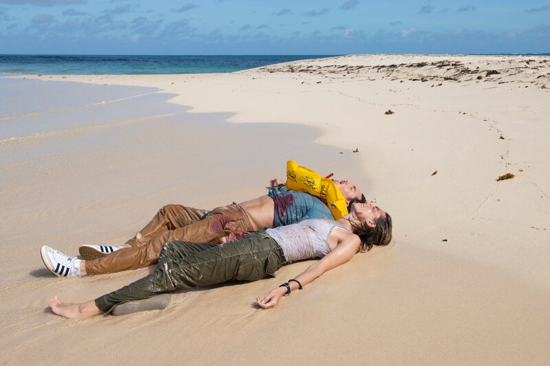 Sara (Allison Williams, r.) und Jackson (Alexander Dreymon, l.) retten sich aus dem Flugzeugwrack auf eine winzige Insel.Bild: © Kelly Walsh / ZDF