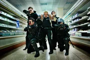Das Team im Einsatz: Wainwright (oben l.), Angel (Simon Pegg, m.), Danny (Nick Frost, oben r.), Thatcher (Olivia Colman, unten l.) und Cartwright (Rafe Spall).Bild: © KinoweltTV