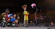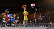 Bei der Erziehung von Dennis (Mitte) gibt es viel zu lachen, wenn auch manchmal auf Kosten von Johnny, der hier in Blobby gefangen ist. Na, wenigstens Murray (l.), Wayne (2.v.l.), Dracula, Dennis, Mavis und Frank (r.) finden es lustig!