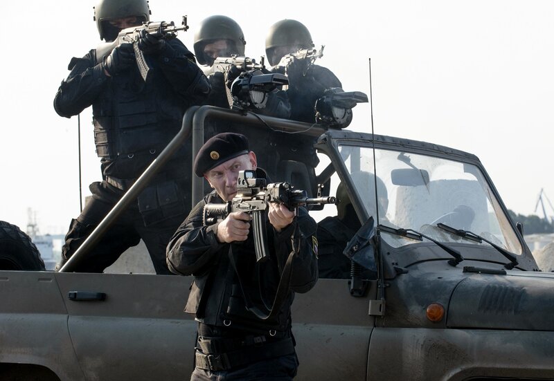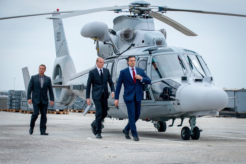 Der russische Präsident Nikolai Zakarin (Alexander Diachenko, r.) und sein Leibwächter Oleg (Yuri Kolokolnikov, M.) treffen auf der Marinebasis in der Kola-Bucht ein.Bild: © Mony Varsano