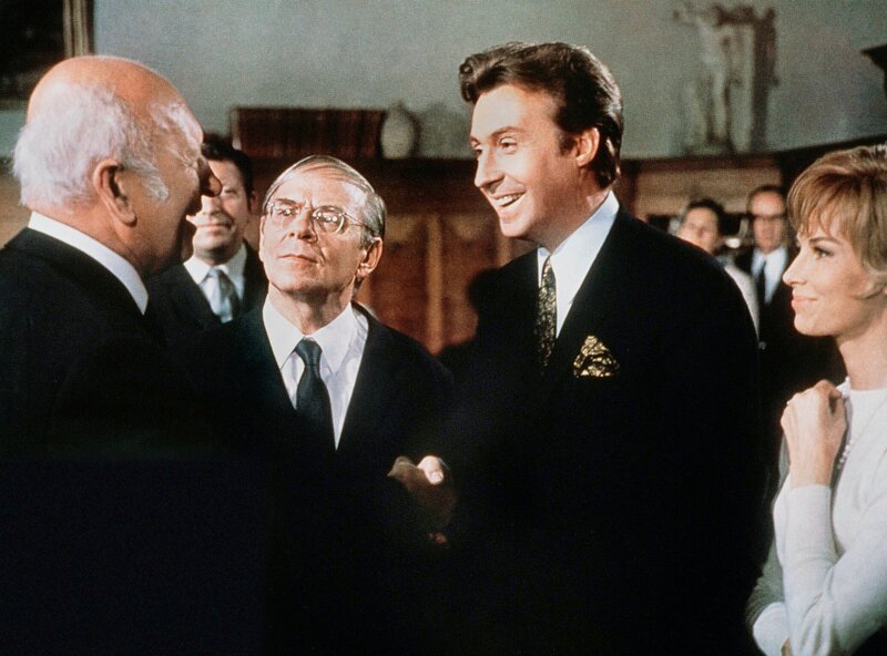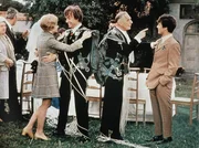 Dr. Peter Bach (Peter Alexander, 3. v. re.) und seine Kollegin Julia Schumann (Gerlinde Locker) haben sich am Mommsen-Gymnasium gesucht und gefunden. Pepe Nietnagel (Hansi Kraus, re.) findet das sehr gut, auch wenn ihm Direktor Taft (Theo Lingen, 2. v. re.) nach einem halsbrecherischen Abenteuer in der Luft gehörig die Meinung sagt.Bild: © ARD Degeto/ARD Degeto
