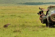 Kameramann Warren Samuels wird von einer jungen Hyäne neugierig beobachtet.Bild: © ORF