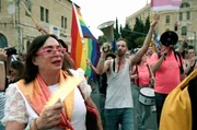 Die Transaktivistin Efrat Tilma (li.) bei der Pride-Parade in Jerusalem 2023: Auf der Abschlusskundgebung ruft sie leidenschaftlich zu Gleichberechtigung auf und kritisiert die Diskriminierung der LGBTQ+-Gemeinschaft durch die israelische Regierung.Bild: © Uriel Sinai/beetz brothers film production/UVS Films
