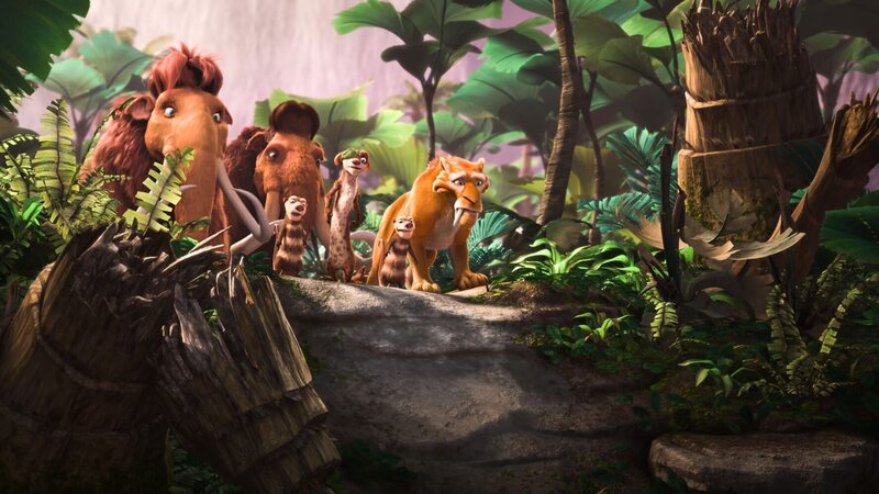 V.l.: Diego, Ellie und Manni trauen ihren Augen kaum, als sie auf der Suche nach Sid in einen Dschungel unter dem Eis geraten: Sind hier etwa Dinosaurier?