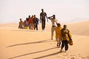 Trotz hoher Transportkosten muss die Reisegruppe um Seydou (Seydou Sarr, 4.v.r.) die Sahara schutzlos zu Fuß durchqueren.Bild: © GRETA DE LAZZARIS