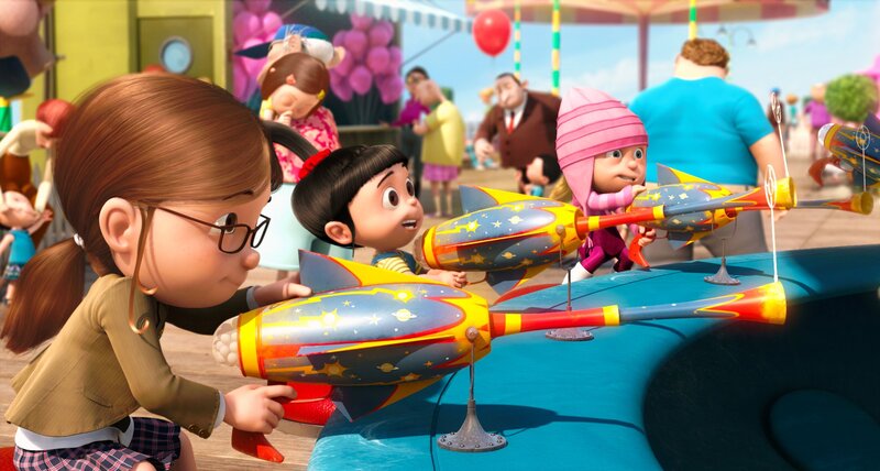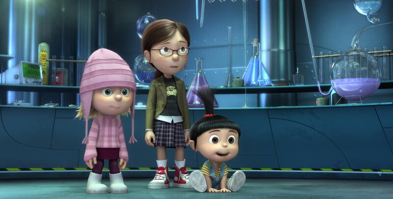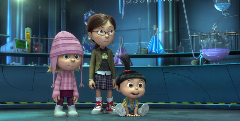 Die drei kleinen Waisenmädchen Edith (l.), Agnes (M.) und Margo (r.) haben sich in den Kopf gesetzt, dass ausgerechnet der bitterböse Gru (M. hinten) der ideale Papa für sie wäre. Eine ziemlich dumme und lebensgefährliche Idee ...