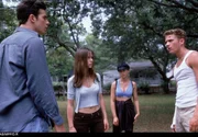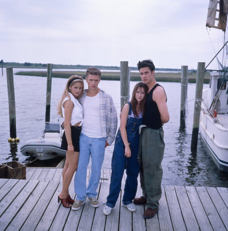 Noch ist ihre Welt in Ordnung: Die vier Freunde Julie (Jennifer Love Hewitt, 2.v.r.), Barry (Ryan Phillipe, 2.v.l.), Helen (Sarah Michelle Gellar, l.) und Ray (Freddie Prinze Jr., r.) auf dem Bootssteg.