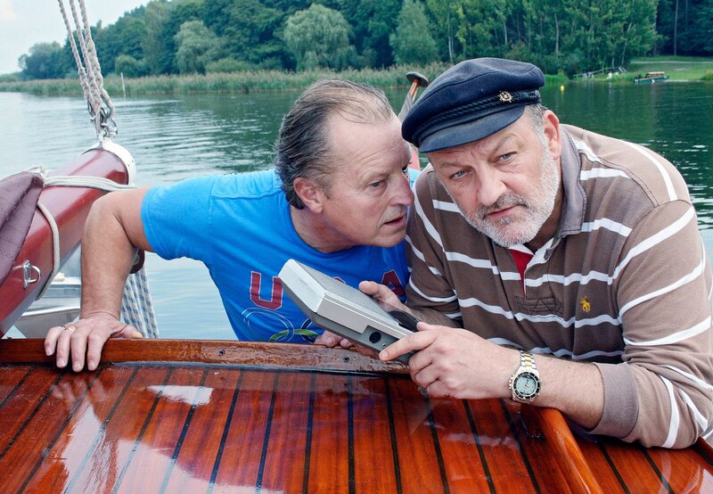 Männer und Technik: Die Hobby-Segler Klaus (Paul Faßnacht, links) und Fred (Leonard Lansink) schlagen sich auf ihrem Boot mit einem Empfangsgerät herum.